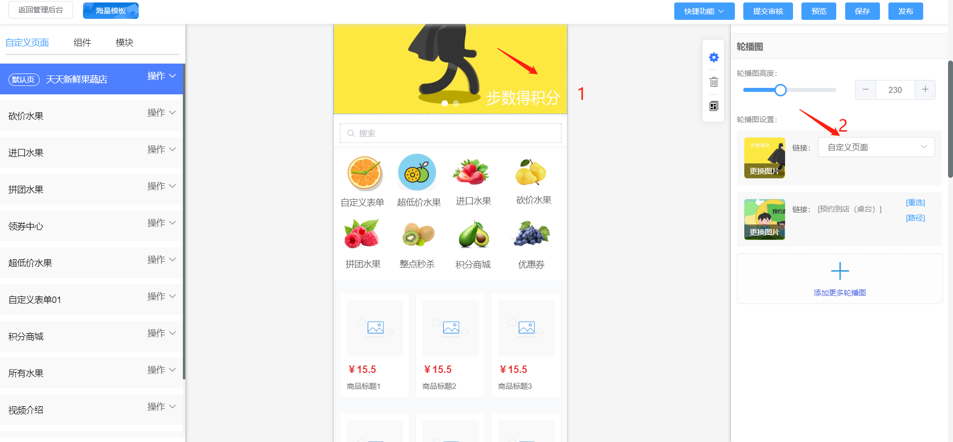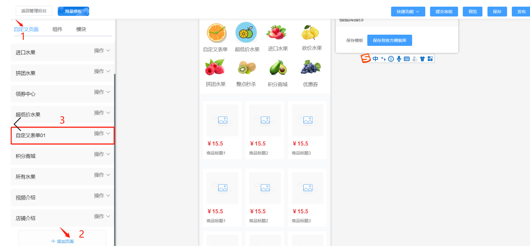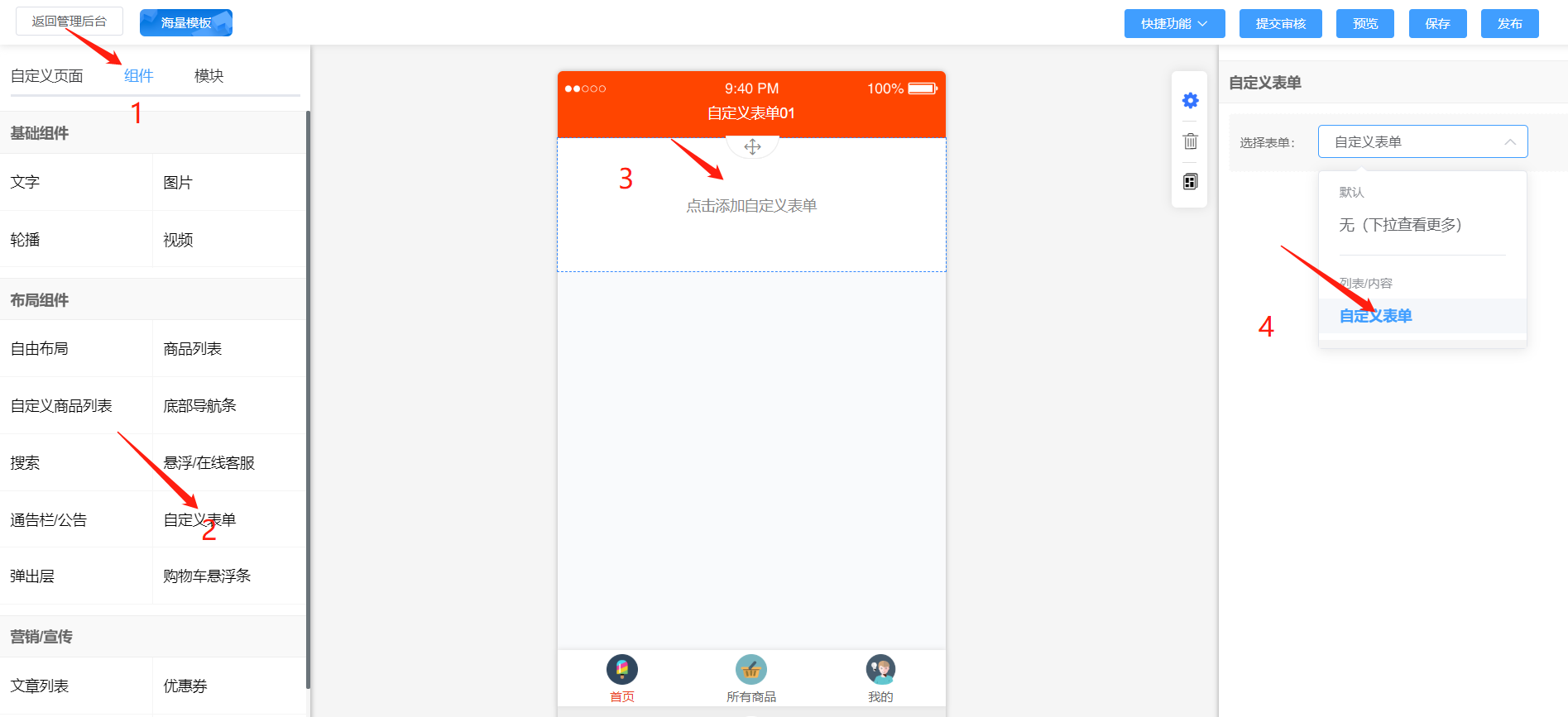 3、装修 ——》选择任意组件 ——》链接到自定义页面 ——》 选择那个有自定义表单的页面——》保存——》发布