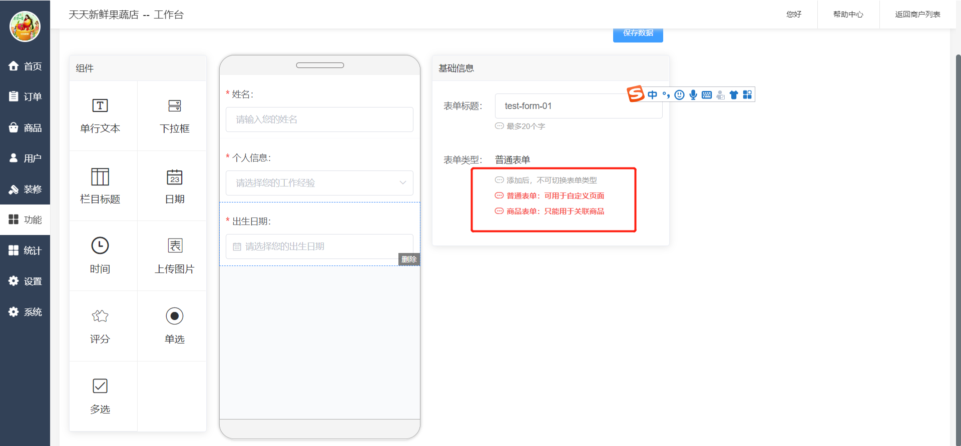 表单用途:主要用于商家收集信息,用户填写表单提交,商家可以在后台看到表单。