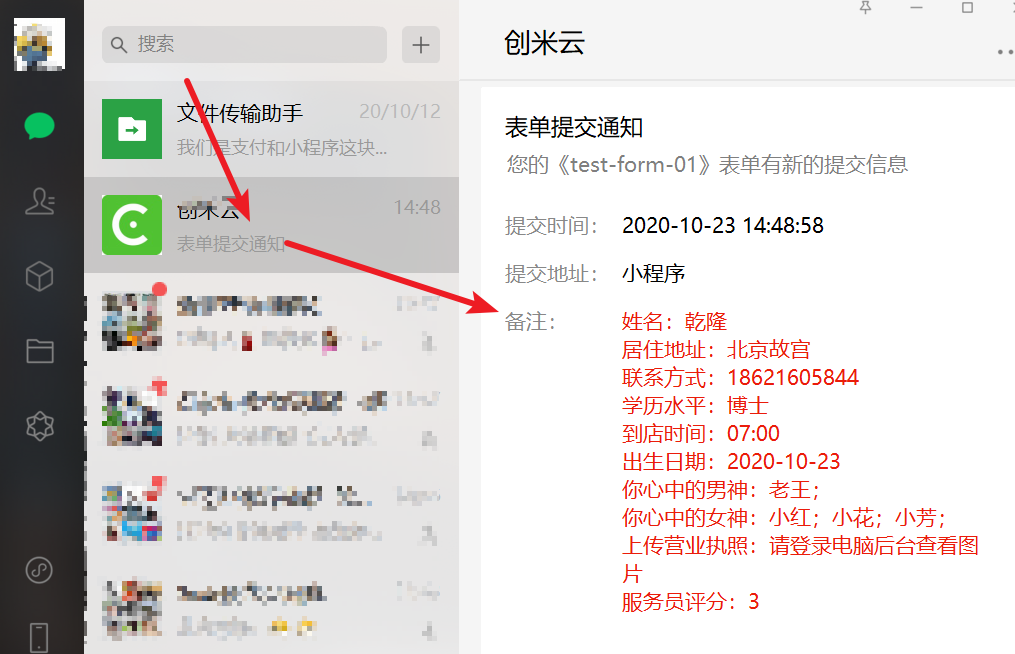 5、系统添加的客服人员(员工)可以在微信里面收到这个表单提交通知并查看,也可以登录系统后台查看表单数据或者导出。
