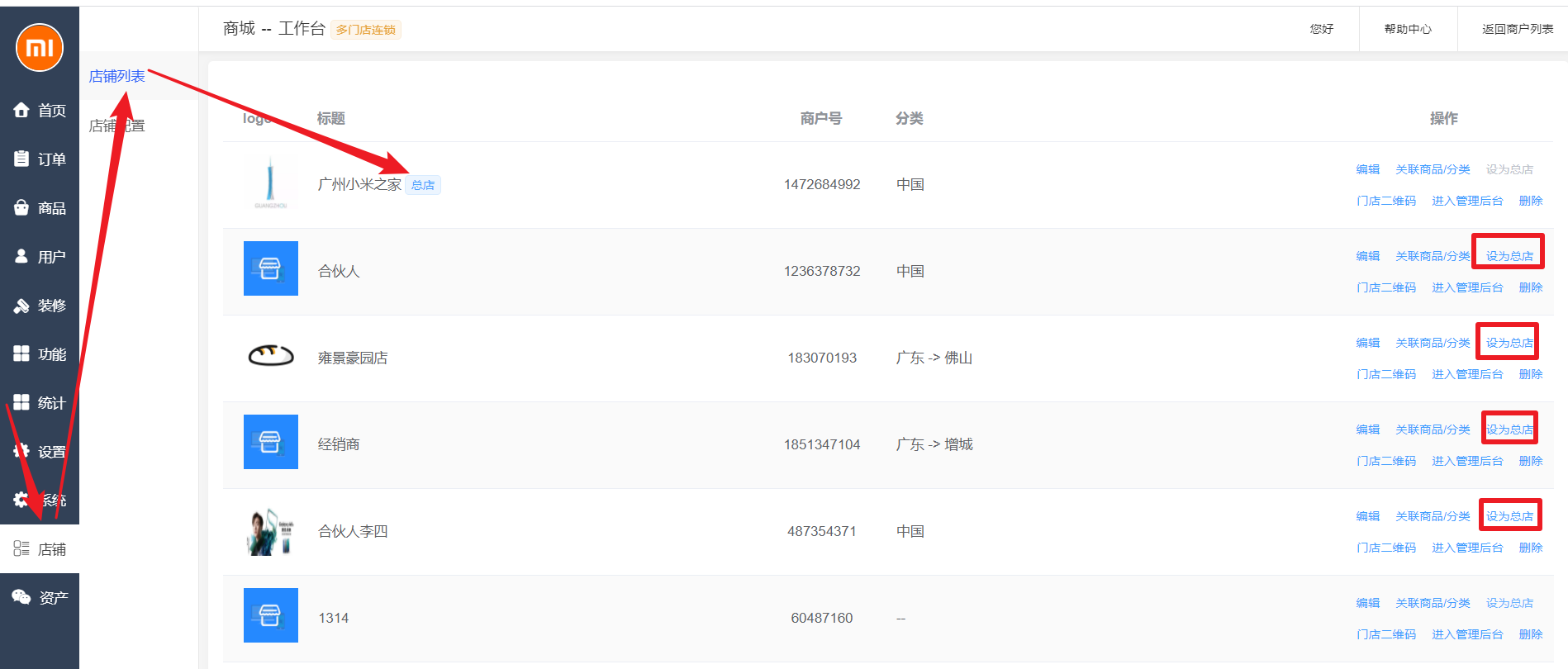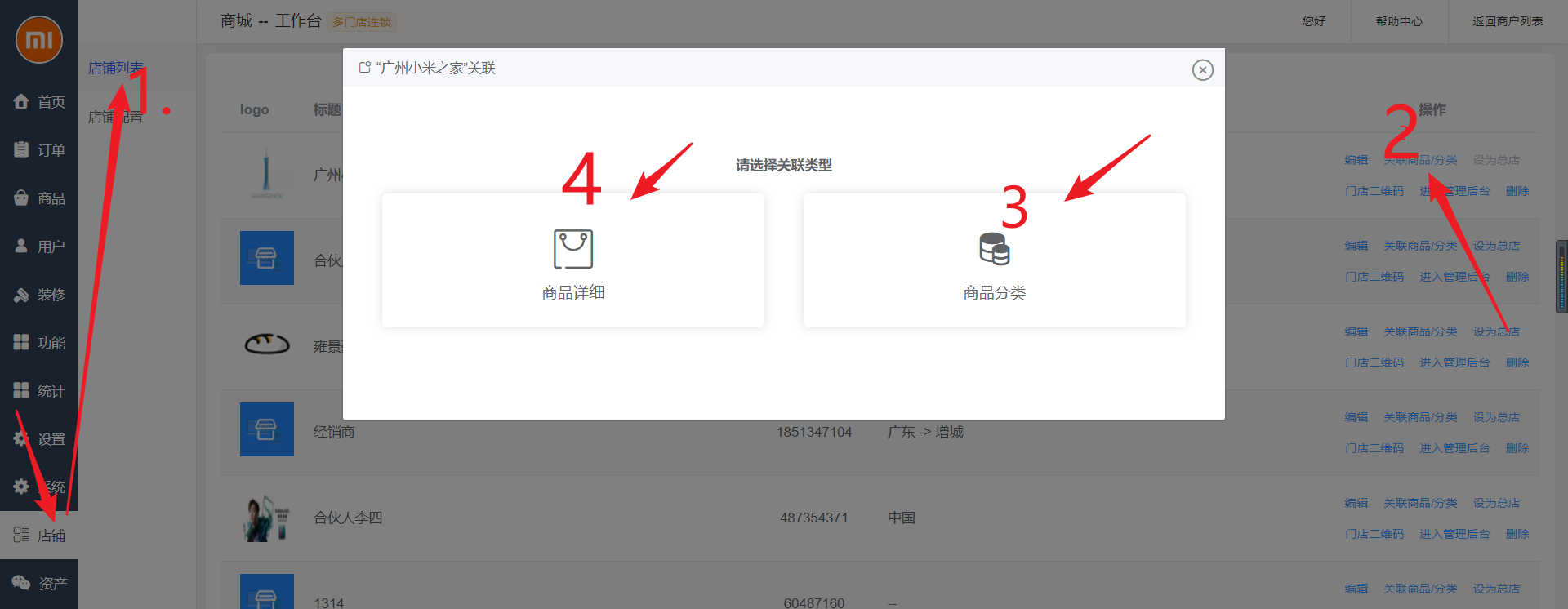 举例:总部里面新增商品类目:水果,水果类目里面新增商品:红富士苹果。有分店1和分店2,总部里面去把这个类目(水果)和这个商品(红富士苹果)关联到各个分店就好。
