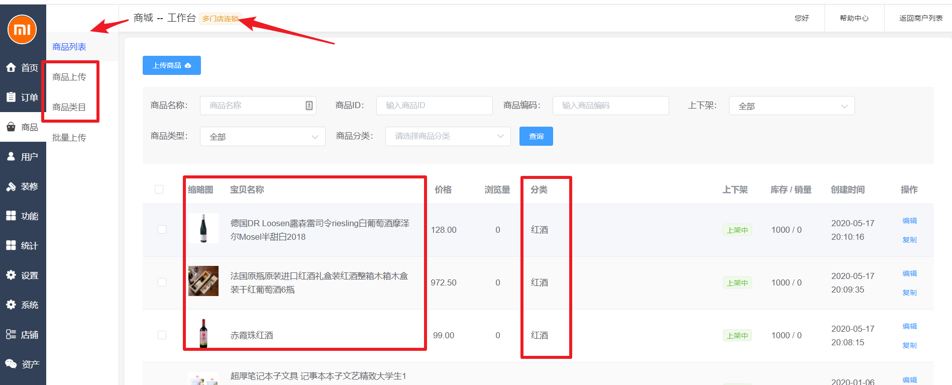 每个分店自己上传就好。比如分店1里面,上传商品类目:水果,水果类目里面上传商品:红富士苹果。
