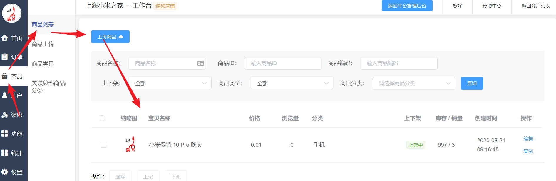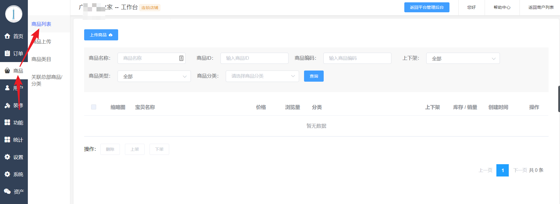 这种分店自己上传的话,商品列表里面可以看到自己的上传的商品。分店都需要自己上传,效率低些。