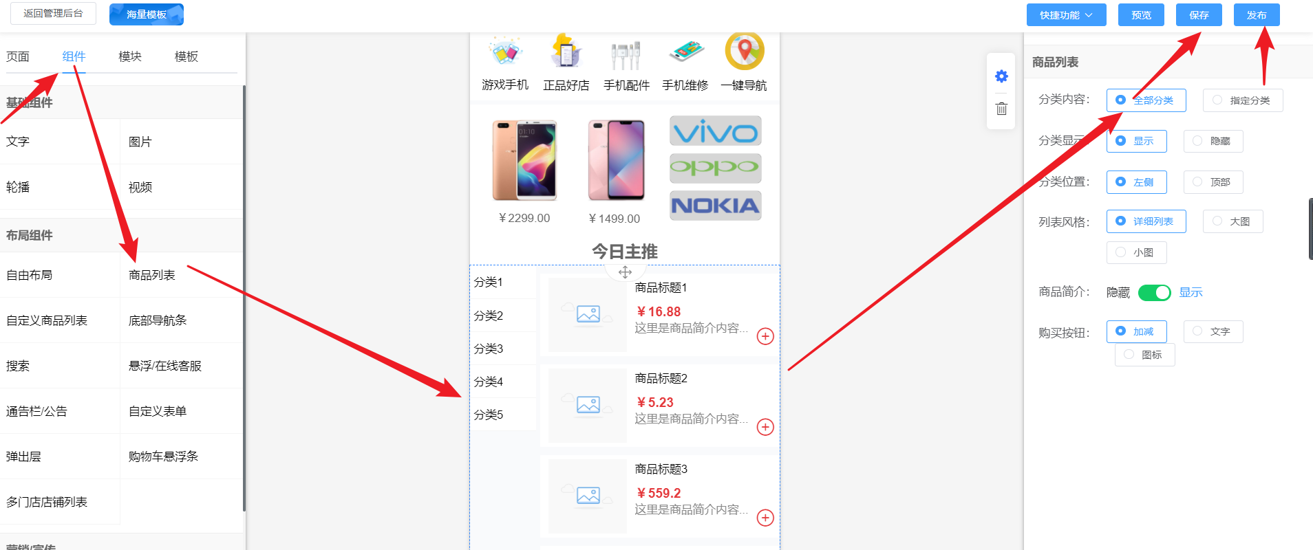 进入装修里面,可以加组件商品列表或者加链接到商品分类(小程序里面显示某个分类下面的商品)。