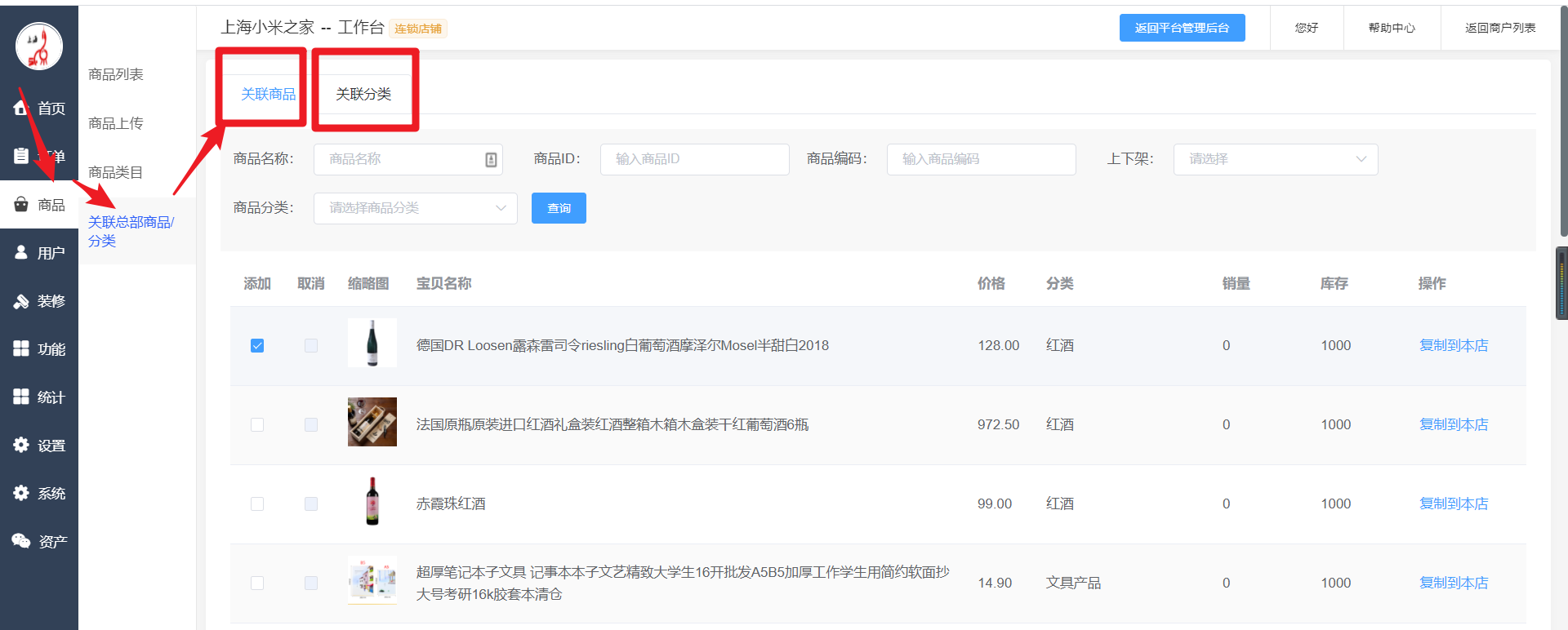 方式一:总部关联商品到各个分店。这样各个分店里面就可以使用总部商品了,自己不用上传了。总部上传一次,其他分店不用上传效率高一些。