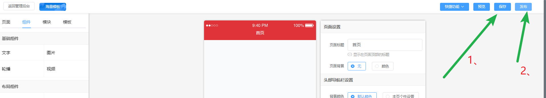 总部里面装修一个页面:进入总部——》装修——》装修设计一个页面——》保存——》发布(注意这里不要加组件-底部导航栏,你加了也不会显示)