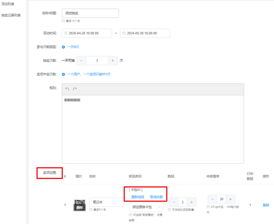 奖品可以是票券卡包,如果用户抽奖中了票券,系统就会自动发放票券卡包给他。