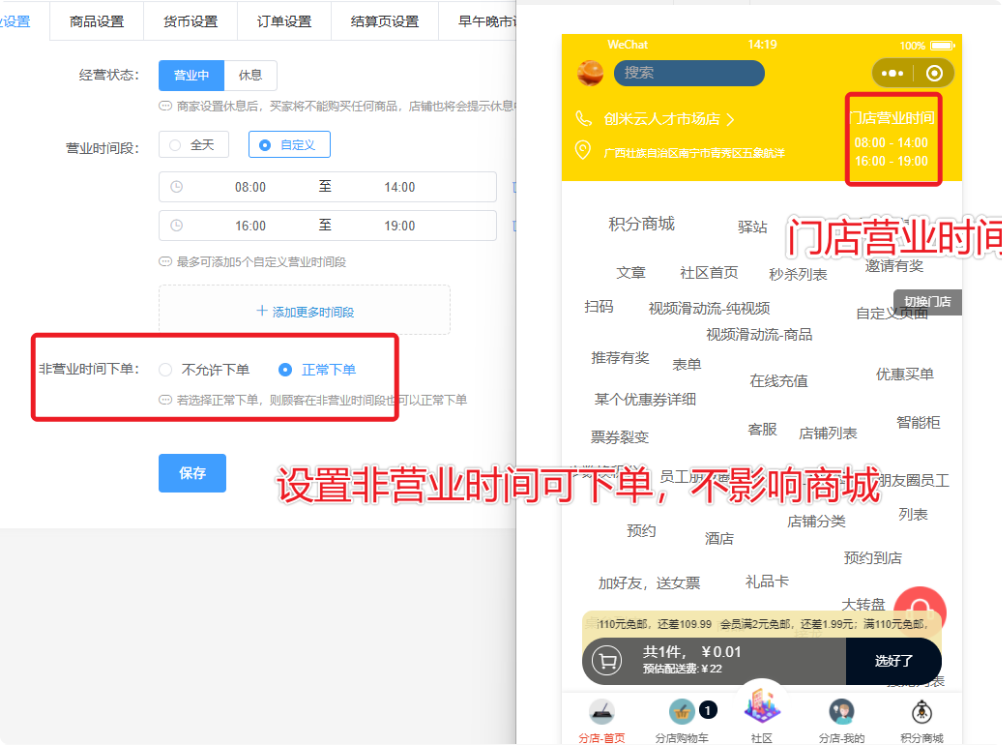 - 开启后,顾客在非营业时间亦可正常下单,并支持预约次日的自提或同城配送时间。