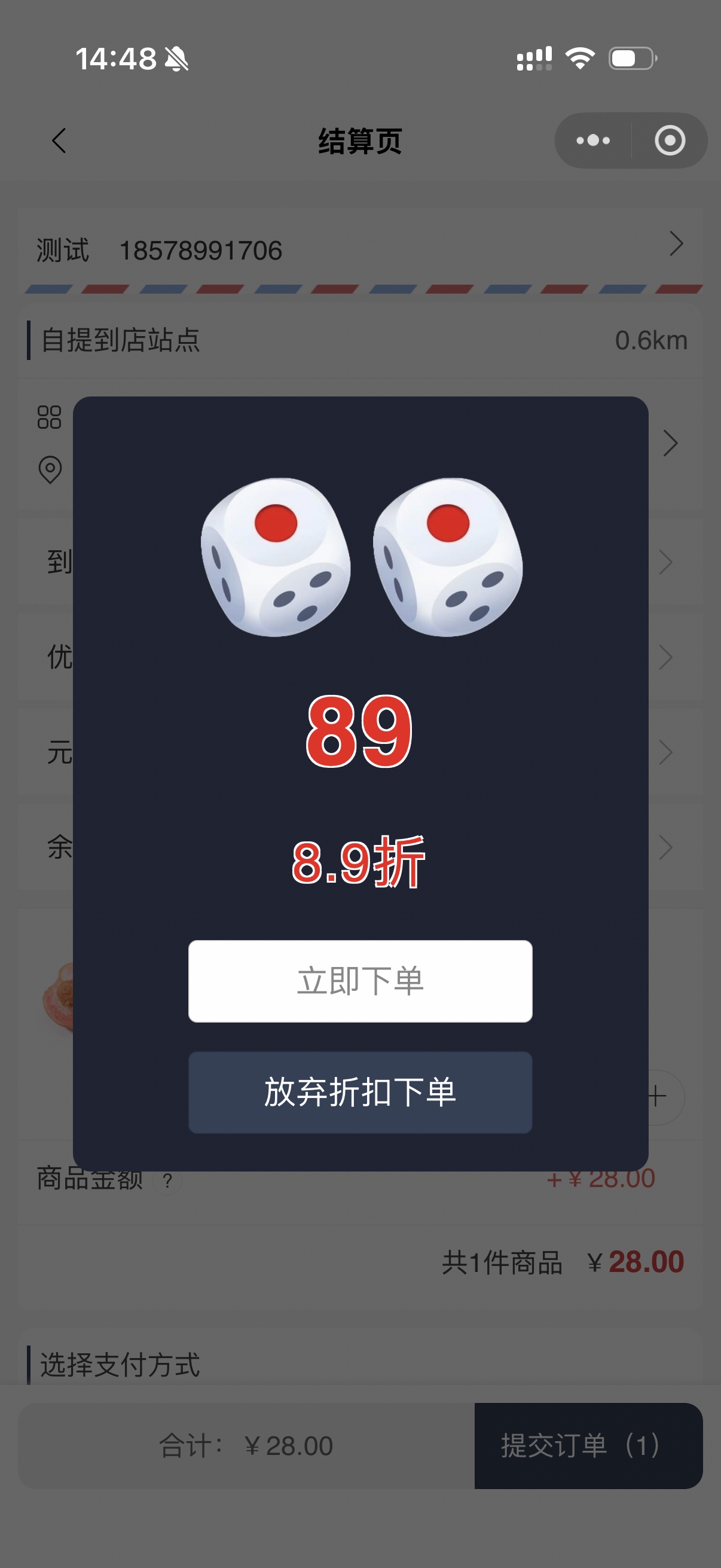 - 顾客在结算页下单支付前,可参与骰子抽奖互动。