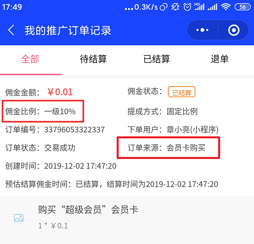 分销商的下级购买会员卡,分销商就会得佣金。会员卡除了可以设置免费领取,还可以收费购买。